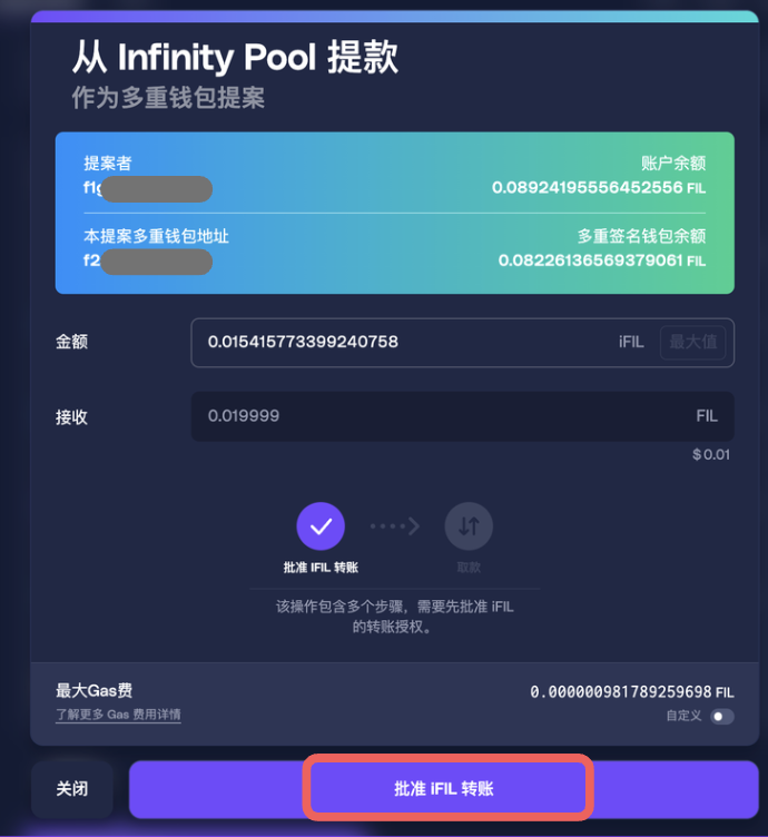 输入您希望提取的 iFIL 金额。点击 “批准 iFIL 转帐” 以允许 GLIF 资金池转移您的 iFIL。在钱包中确认交易并等待处理完成。