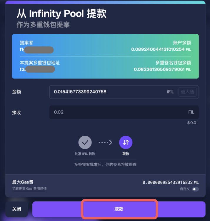 现在,您可以顺利地使用多签钱包从 GLIF 池中取回所存入的 FIL。记得随时仔细核对地址和交易信息,以确保资金安全。