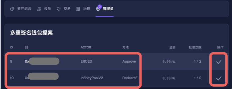 确认交易后,系统将自动生成两个多签提案:“Approve” 和 “RedeemF”。